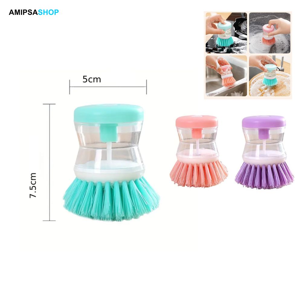 Abwaschbürste mit Flüssigkeitsspender, Material: Kunststoff-Haarbürste. Farbe: Grün, Rosa, Lila.