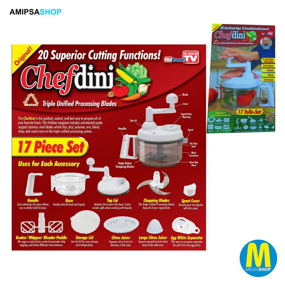 Hobeln, Raspeln, Reiben, Zerkleinern, Rühren, Mischen und mehr: schneller und einfacher geht’s kaum! Bald werden Sie Chefdini, das vielseitigste Küchengerät Europas mit 30 Funktionen, nicht mehr missen wollen. Chefdini – komplett mit jeder Menge Zubehör