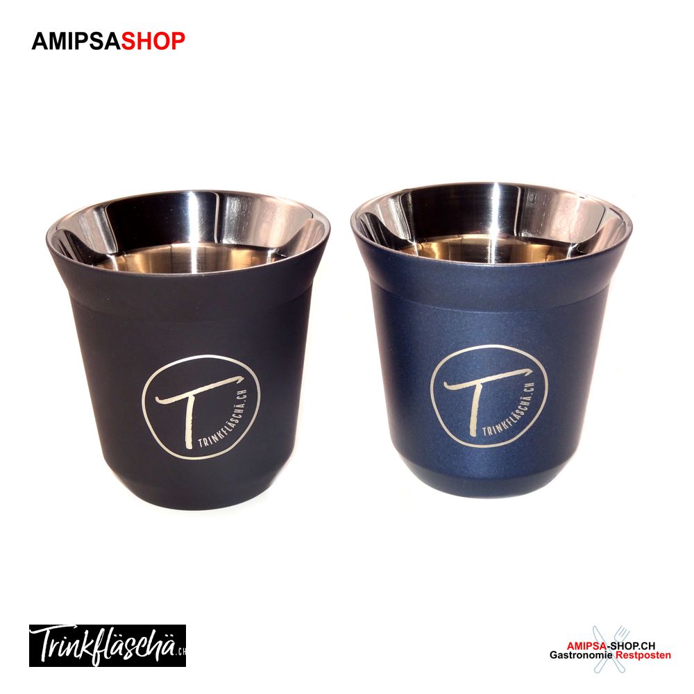 Espresso Tasse 80ml 304 Edelstahl, mit Logo wie auf dem Bild. Erhältlich in den Farben Schwarz oder Dunkelblau.