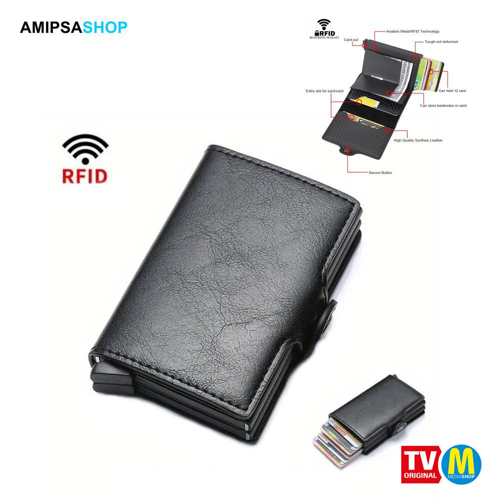 In elegantem Design. Mit Alu-Protect-Case zum Schutz vor Datendiebstahl. Die spezielle Schutzvorrichtung fasst bis zu maximal 12 Karten und verfügt ausserdem über einen ausgeklügelten Kartenausschub mit Slide-Control-Mechanik für einfaches, gefächertes Herausschieben der Karten. Die Stop-Drop-Technik verhindert, dass Karten herausfallen können, selbst wenn der Card kopfüber gehalten wird. Deckel aus hochwertigem Kunstleder. Magnetverschluss. Grösse: 6.5 x 9.7 x 2.5cm