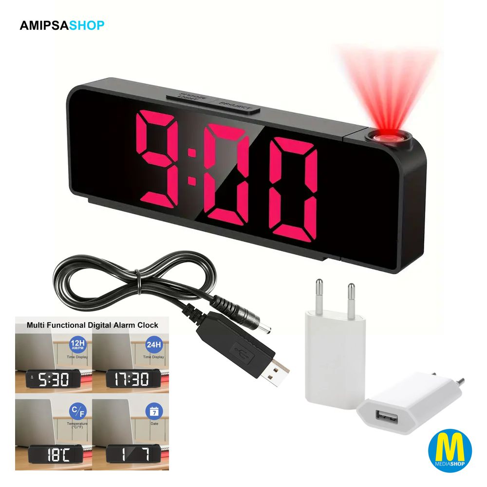 Projektions Wecker, Projektionswecker, LED-Digitaluhr für Schlafzimmer mit 180° drehbarem Projektor, USB-Kabel + USB Gerät 5V 1A , 3-stufiger Helligkeitsdimmer, Datumsanzeige, Schlummerfunktion, 12/24-Stunden, Massen ca` 19.6 x 6.4 x 2.3 cm.