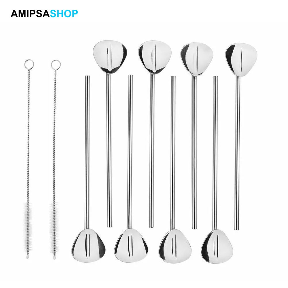 Trinkhalmlöffel Strohhalme Edelstahl 10tlg. Trinkhalmlöffel 8 Stück + 2 Bürste.